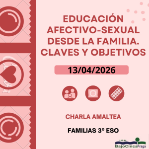 ¡Atención familias de 3º ESO! El próximo lunes 13 de abril a las 16:00 os invitamos a una charla informativa organizada por AMALTEA sobre un tema fundamental: las relaciones afectivo-sexuales. Será un espacio cercano y seguro donde abordaremos dudas, ofreceremos orientación y compartiremos herramientas para acompañarles. Dirigido a: Familias de AMALTEA Hora: 16:00 ¡Os esperamos para aprender y crecer juntos/as!